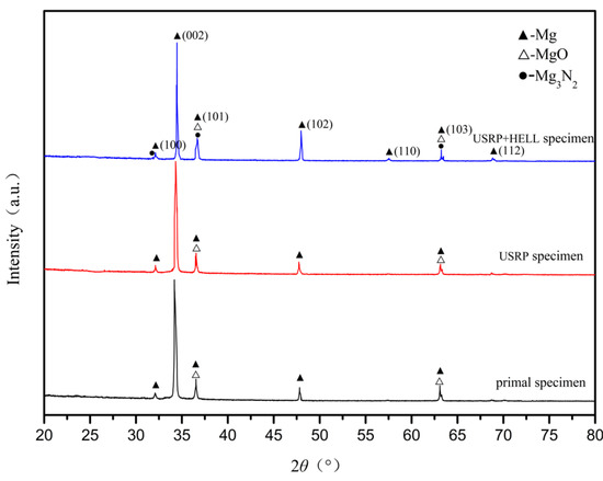 Plastic flow occurred on the surface of the USRP specimen under the action of multi-directional force during ultrasonic rolling; thus, the “peaks” on the material surface flowed into the “valleys,” significantly reducing the mechanical defects (scratches) of the original specimen. The addition of lubricating oil on the surface of the sample further reduced the friction between the ball of the processing head and the surface of the sample, and thus the ultrasonic surface-rolling treatment significantly reduced the surface roughness of the sample [28]. Further reduction of surface roughness after ion implantation may have been due to sputtering, etching, and diffusion processes under this implantation dose. The results of the microhardness showed an increase in microhardness and the formation of a hardened layer after ultrasonic surface-rolling treatment. These results are due to the fact that ultrasonic-rolling treatment can produce better deformation hardening effects and fineness in the surface layer within a certain depth of the material. The grain-strengthening effect is caused by grain refinement, strain strengthening, and residual compressive stress. Studies have shown [29,30] that a smaller grain leads to greater microhardness. Hard phases such as Mg3N2 in the modified layer after N ion implantation are the main reasons for the increased microhardness.