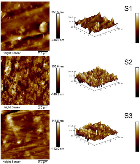 Three−dimensional AFM images of the samples: (S1) primal specimen, (S2) USRP specimen, (S3) USRP + HELL specimen.