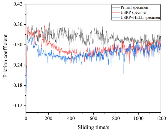 The coefficient of friction is the ratio of the frictional force between two surfaces to the vertical force acting on one surface. A smaller coefficient of friction leads to more wear resistance. The coefficient of friction is related to such factors as the surface roughness, hardness, and strength. The friction coefficient curves of AZ31 magnesium alloy samples treated with different processes are shown in Figure 3: At the beginning of friction, the friction coefficient of magnesium alloy samples treated with different processes increased with almost the same slope and then fluctuated within a certain interval. In the initial running-in wear stage, the softer substrate was first worn away by the harder surface of the friction pair, thus resulting in furrows, fractures, or chips; the friction factor was larger. The friction coefficient then stabilized. The average friction coefficient of the original AZ31 magnesium alloy was about 0.321 in the 1200 s test period. The friction coefficient of the samples in the ultrasonic rolling place were improved due to the improved surface quality. The average friction coefficient was about 0.29, and the friction coefficient of the USRP specimen was smaller than the ground specimen throughout the entire friction process. The friction coefficient of the samples after N ion implantation was further reduced, and the average friction coefficient was about 0.276 due to the combined effect of the emergence of hardened phase nitrides, hardness enhancement, and surface roughness after ion implantation.