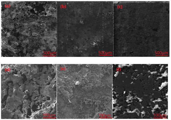 Typical SEM images of samples with different treatments immersed in SBF solution and 5 wt% NaCl aqueous solution: (a,d) primal sample; (b,e) USRP sample; (c,f) USRP + HELL sample.