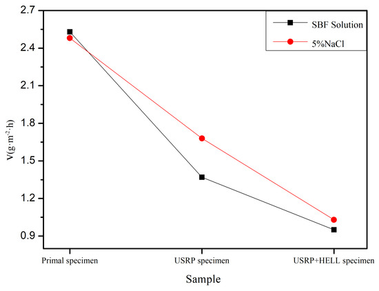 In summary, the comprehensive effects of surface roughness, grain refinement, and residual compressive stress after USRP + HELL composite process further improved the corrosion resistance of magnesium alloy surfaces, thus indicating that the USRP + HELL composite is the best way to improve the friction and corrosion resistance of magnesium alloys. This is an effective method, and it is worth further studying the effect of composite treatment process parameters on the microstructure and properties of magnesium alloys.