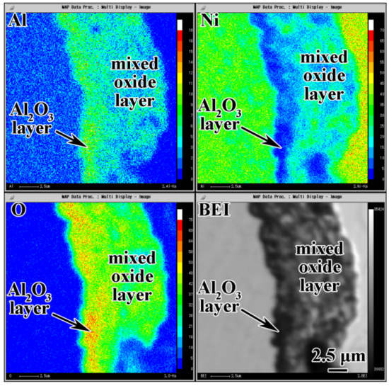 By comprehensive analyses of Figure 1b, Figure 2d, Figure 3 and Figure 4, the conclusion can be drawn that a two-layered scale was formed on the gradient coating through the preoxidaton treatment, which can be named the preoxidised coating. The major portion of the scale was a three-phase mixture layer including NiO, NiAl2O4 and Al2O3, of which the thickness was about 6 μm; underneath the layer there was a continuous thin pure lamina of Al2O3, the thickness of which was about 1 μm.