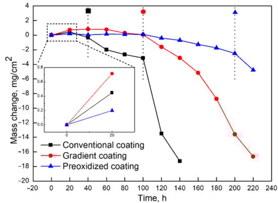 The alkali metal sulphate-induced hot corrosion kinetics curves of the three coatings at 900 °C are plotted in Figure 5. The error bars have been neglected for the tiny differences between each group of data. The gradient coating exhibited the fastest mass gain during the initiation stage (0–20 h) of hot corrosion, followed by the conventional and preoxidised coatings in sequence, which is shown in the partial enlarged detail in Figure 5. The gradient coating’s relatively fast mass gain resulted from the rapid oxidation of the porous alloy layer. After this, the conventional coating, unlike the gradient and preoxidised coatings, started to exhibit weight loss. The mass of the gradient coating remained unchanged for 20–60 h of the hot corrosion test, which is represented as ‘a plateau region’ in the kinetics curve. It is suggested that the mass gain deriving from the ongoing formation of the oxide scale approximately compensated the mass loss deriving from the unwished dissolution and spallation of the scale into the molten salt. In other words, the scale’s growth rate equalled the ‘dissolution + spallation’ rate. The preoxidised coating also had a similar but much longer plateau region. After about 40 h of the hot corrosion test, the conventional coating showed a drastic weight loss and was on the verge of failure, while the mass changes of the gradient and preoxidised coatings maintained positive values. Severe weight loss resulted with the gradient and preoxidised coatings after about 100 and 200 h, respectively.