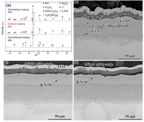 Figure 6a shows the surface XRD curves of the three coatings after hot corrosion for 60 h at 900 °C. Corresponding cross-sectional morphologies are presented in Figure 6b–d, respectively. The corrosion products on the conventional coating were mainly Cr2O3, in which an alloy particle zone emerged, denoting that internal oxidation had occurred. This phenomenon is distinct from that of the high temperature oxidation in static air [26]. In that case, after 1500 h of oxidation at 1000 °C in air, the oxides are mainly composed of α-Al2O3 for the same coating. The distinction may be due to one or more of the following three factors. Firstly, when the ratio of Cr content to Al content is larger than 4, the scale is mainly composed of Cr2O3; otherwise, the scale is composed of Al2O3, as proposed in the study of Felix and et al. [30]. The Al reservoir in coatings is continually consumed to repair the protective scale with the ongoing spallation and dissolution of the scale. Since Al content in the conventional coating was the lowest of the three coatings, it may have fallen below the critical Al content for selective oxidation, leading to the formation of Cr2O3. Secondly, Al2O3 formed earlier dissolves earlier than Cr2O3 in the molten deposit salt. Thirdly, although the solubility of Al2O3 in molten salt is lower than that of Cr2O3 according to the solubility curves for some oxides in Rapp’s review [2], Otsuka and Rapp [31] consider that Cr2O3 is more stable than Al2O3 in hot corrosion because of the positive solubility gradient of Cr2O3, which disobeys self-sustained dissolution.
