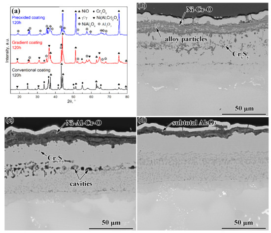 It can be seen in Figure 7a that the scale of the conventional coating was mainly composed of NiO and some Cr2O3 and Ni(Al,Cr)2O4 after the hot corrosion test which lasted 120 h. This indicates that the contents of Al and Cr were so low that the conventional coating could not maintain the slow growth of the relatively stable and protective Cr2O3 scale. In Figure 7b, severe internal sulphidation could be observed in the conventional coating. Meanwhile, the thickness of the coating decreased greatly to around 32 μm from around 45 μm. Combined with the flash crash of mass loss after 120 h (Figure 5), the conclusion can be drawn that the failure of the conventional coating was verified.