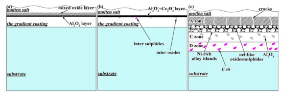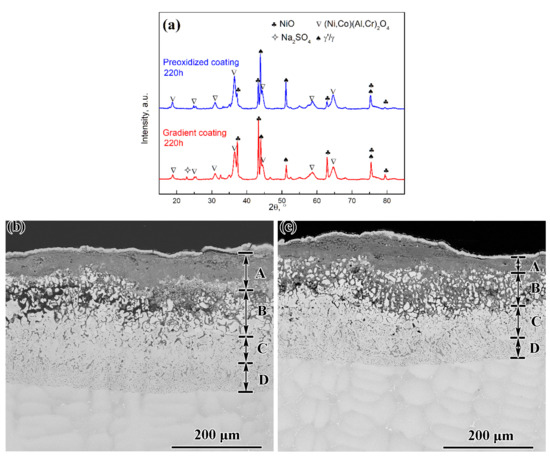 As shown in Figure 8, both the gradient and preoxidised coatings underwent a remarkable mass loss after 220 h; the average values per unit were 16.64 mg cm−2 and 4.79 mg cm−2, respectively. Figure 8a shows that the corrosion products of the two coatings both consisted of NiO, Ni(Al,Cr)2O4 and even trace amounts of Co(Al,Cr)2O4 (the cobalt came from the substrate). In Figure 8b,c, the corrosion depths of the specimens with the gradient and preoxidised coatings reached around 265 μm and 240 μm, respectively, which far exceeded their original coating thicknesses (both around 60 μm). The degradation microstructures of the two coatings were similar, and the original interface between the coating and the substrate could not be identified with the severe internal oxidation and sulphidation. Complete failure of the two coatings was verified.