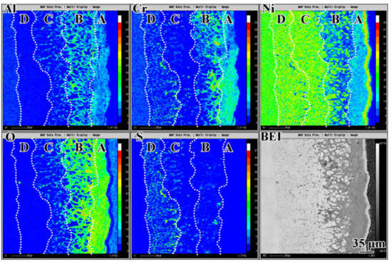 The EPMA method was employed to scan the specimen with the preoxidised coating after 220 h, and the element distribution maps of sulphur, chromium, aluminium, oxygen and nickel are illustrated in Figure 9. According to these, specimens with the preoxidised coating can be divided into four zones which are individually defined as A, B, C and D zones, excepting the substrate: