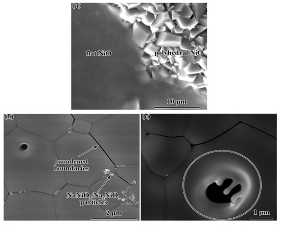Thus, those particles were probably NaNiO2 and/or Na2NiO2. Meanwhile, it was found that some grain boundaries along which those particles precipitated were wider than others in Figure 10b. This phenomenon of the broadening of boundaries is connected to but not directly caused by the dissolution of NiO. If the dissolution of NiO in molten salt were the direct cause, the outline of the boundaries should have been smooth and mellow, similar to the morphology of the cavity verge in the circular region in Figure 10c. In fact, the broadening of NiO grain boundaries would likely involve two steps: