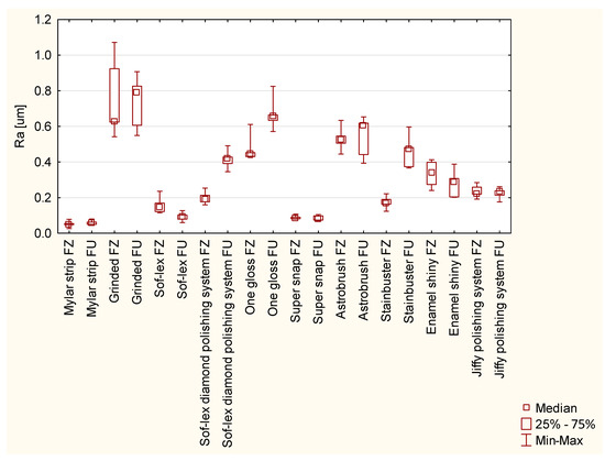 No statistically significant differences are found between the smoothness of the materials based on the application of a specific polishing system. However, some trends are visible. After applying Sof-Lex, Super Snap, Enamel Shiny, and Jiffy Polishing System, a smoother surface is observed for FU, while after polishing with Sof-Lex Diamond Polishing System, Stainbuster, One Gloss, and Astrobrush, a smoother surface is observed for FZ, which is illustrated in Figure 1 and Figure 2.