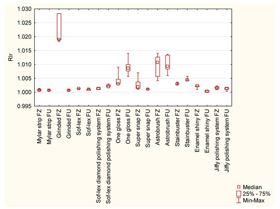 The lowest Rlr values are obtained after polishing the samples with the Enamel Shiny for FU (1.000), and with the Sof-Lex, the Sof-Lex Diamond Polishing System, and Jiffy Polishing Kit for FZ (1.001) [Table 5 and Table 6, Figure 2]. The value is only slightly higher after polishing both materials with Super Snap (1.001 for FU and 1.002 for FZ).