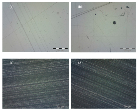 Photos from an optical microscope at 100 times magnification: (a) FU after binding under Mylar strip; (b) FZ after binding under Mylar strip; (c) FU after grinding with 600 grit sandpaper; (d) FZ after grinding with 600 grit sandpaper.