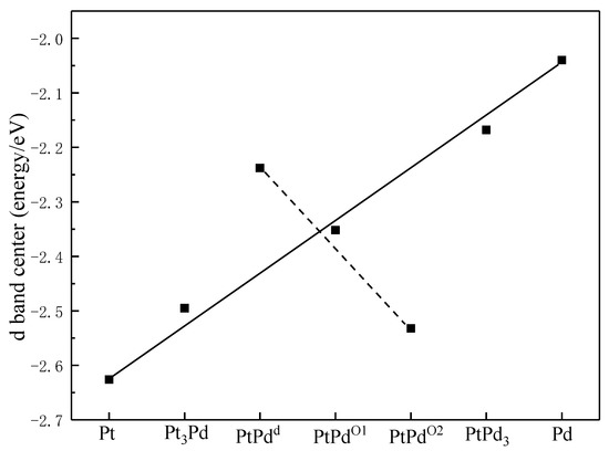 To examine the synergistic effects between Pt and Pd in the PtmPdn system, the d band centers of the PtmPdn(111) surfaces were calculated. As shown in Figure 2, Pt has the lowest d band center with a value of −2.626 eV, while Pd has the highest d band center with a value of −2.040 eV. The d band centers of PtmPdn move closer to the Fermi level with the increase of Pd atoms. When the ratio of Pt:Pd is 1:1, the d band centers of PtPdd, PtPdO1, and PtPdO2 are calculated to be −2.352, −2.532, and −2.238 eV, respectively. Specifically, the d band centers of PtPdd and PtPdO1 are neither too high nor too low, and may possess better activity than the other alloys; the PtPd with the ration of 1:1 may be the most potential candidate as the MOR catalyst [35].