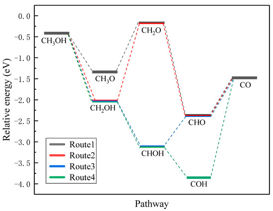 Four routes of methanol dehydrogenation on the pristine Pt(111) surface.
