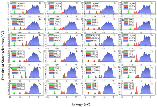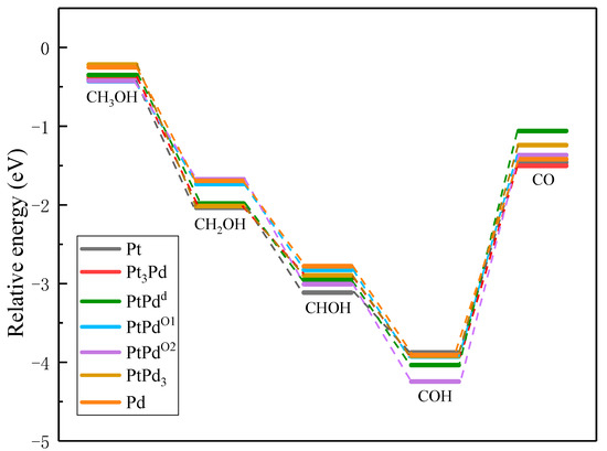 To compare the activities of various PtmPdn catalysts, the thermodynamically favorable route 4 (CH3OH→CH2OH→CHOH→COH→CO) was studied further on various PtmPdn(111) surfaces. As illustrated in Figure 6 and Table S1, the methanol adsorptions do not show big differences from each other on every PtmPdn(111). While for the adsorption of CH2OH and CHOH, Pt(111) has the strongest adsorption compared to the other surfaces, though the differences among the adsorption energy are still not very large. However, when the Pt:Pd ratio is 1:1, the adsorption of COH becomes very favorable, especially for the ordered PtPdO2 alloy with the outmost layer of Pd. Furthermore, the disordered PtPdd alloy with a Pt:Pd ratio of 1:1 depicts the weakest adsorption for CO, and moderate adsorption for all intermediates. According to the Paul Sabatier principle [40], the random PtPd alloy with a 1:1 ratio may possess the best activity for MOR. In addition, as shown in Figure 7, the partial density of states (PDOS) of the methanol molecule and the intermediates adsorbed on the Pt, Pd, PtPdd alloys were comparatively studied, since the DOS can be effectively used to study the hybridization of the electron orbital between the adsorbed substance and the substrate [41]. Though the d orbitals of Pt, PtPdd, and Pd show three sharp peaks and the methanol molecule has two sharp peaks ranging from −4.9 to −1.0 eV, the peaks are mismatched, indicating that only weak physical interactions exist between the adsorbed CH3OH and the Pt(111) as well as the PtPdd(111) and Pd(111) surfaces, consistent with the previously calculated adsorption energy. A similar phenomenon can also be observed for the adsorptions of CH2O, which are also physical interactions. Being different from that of CH3OH and CH2O, the p orbital of the COH molecule and the d orbital of PtPdd overlaps significantly, ranging from −6.1 to −7.8 eV, which indicates a strong chemical interaction between the adsorbed COH molecule and Pt(111), as well as PtPdd(111) or Pd(111) surfaces; the most overlap can be observed for the PtPdd catalyst. CH3O, CH2OH, CHOH, CHO, and the CO species more or less overlap, which means that the electron interaction between these intermediates and catalysts can be observed. For CO adsorption, it can be found that both the s and p orbitals of CO will interact with the d orbital of PtmPdn(111) around −7.8 and −5.8 eV since the matched peaks can be observed as shown in Figure 7h,p,x.