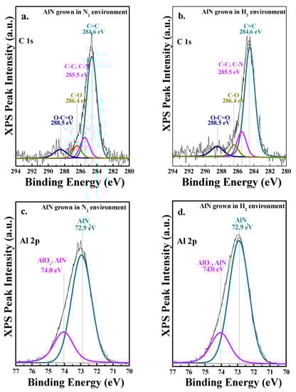 The XPS survey scans (presented in Supplementary Material) and high-resolution (HR) scans were recorded at two locations—the surface and 5 nm depth from the surface of the samples. The removal of the first atomic layers was performed by Ar+ ion sputtering. We analyzed the scan at a depth of 5 nm only because of ambiguities in the surface scan due to surface contamination associated with sample handling. The Binding Energy (BE) of all XPS spectra of two AlN thin films was corrected with respect to the carbon 1 s (C1s) peak at 284.6 eV to avoid charging effects. The survey scan showed that XPS spectra were composed of aluminum, nitrogen, carbon, oxygen, and maybe hydrogen. There is a chance that both samples might have contained some hydrogen, but hydrogen cannot be detected as it only has one electron and a small photoionization cross-section. Figure 5a,b show the deconvoluted C1s peak for the AlN samples grown with N2 and H2 carrier gases, respectively. The main peak contribution of the spectra of C1s measured at the surface of AlN is at 284.6 eV, characteristics of adventitious C. We observed that the intensity of C1s dropped significantly at 5 nm depth, leading to the actual amount of C in the sample. The C1s spectra can be deconvoluted into four different chemical states, namely C=C at 284.6 eV, C-C/C-N close to 286.6 eV, C-O close to 288.4 eV, and O-C=O bond close to 288.6 eV [10,11]. The XPS high-resolution scan of aluminum 2 p (Al2p) chemical state at 5 nm depth is shown in Figure 5c,d for AlN samples grown in N2 and H2 with carrier gases, respectively. The atomic concentration of Al is higher in the case of H2 carrier (Table 1). In both cases (N2 and H2 carrier), the Al 2p peaks are composed from two contributions: one at 72.9 eV BE and one at 74.0 eV BE. It is expected that the Al 2p peak around 73 eV is the characteristics for AlN and the one at 74 eV could be either AlN or some oxidized Al [17]. Note that the deconvoluted peak positions are the same for both deconvoluted peaks confirming the same type of ionic bonding states in both samples [18,19]. Figure 4f and Figure 5e show the HR O 1s peak for the cases of N2 and H2 carrier gases, respectively. The HR O 1s peak can be deconvoluted and fitted at least with three chemical states at BE 530.5, 531.8, and 533.4 eV. The peak at 530.5 eV can be attributed to Al-O bonds and the peaks from 531.8 eV and 533.4 eV to carbon-oxygen bonds and hydroxyls [20]. The O 1s peak associated with Al indicated that the oxygen is dissolved into the AlN layer, oxidizing part of the Al and part of the carbon contamination. We observed that the metal oxide formation before and after etching was mostly similar without any presence of nonbonding oxygen, which was previously reported by Liang et al., which was created during etching. Figure 5g,h show the deconvoluted HR N1s peak for both samples. It is evident that the peak consists of entirely AlN contributions which are expected to be recorded in the range between 396 eV and 398 eV [17].