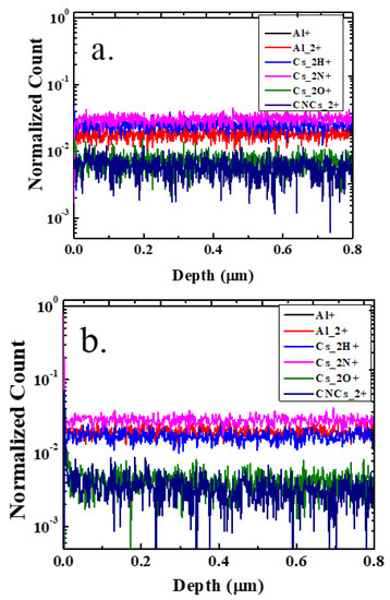 To further investigate the presence of impurities and at different depths from the sample surface in the AlN films, the secondary-ion mass spectrometry (SIMS) was utilized in time-of-flight (ToF) mode. Figure 6 shows the average relative SIMS detected counts for Al2+, Al+, H+, N+, and O+ (with respect to Al+ normalized to (1) for both AlN samples grown with N2 carrier and H2 carrier gases. No significant change was observed in the composition of various compounds up to 0.8 µm (and beyond data are not shown here). The normalized count values for O+ and C+ in case of the sample grown using H2 carrier gas was much less. Compared to N2 grown samples, H2 grown samples have 33–39% less C, 33% less H, 41% less O; a similar trend was observed in XPS analysis of these samples. The percentage difference of oxygen was close in case of SIMS and XPS measurements, but there was a difference for carbon. This may arise due to measurement techniques. Moreover, XPS measurement was taken at 5 nm depth, whereas the SIMS profile was taken up to a much higher depth.