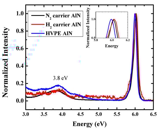 To further understand the presence of impurities, the samples were studied by cathodoluminescence (CL). In III-nitride semiconductors near band edge emissions, such as free exciton or bound exciton recombination, are characteristics of high-quality materials with lower impurity concentration and lower defect density [22,23]. Figure 7 shows CL spectra of the AlN sample grown with the N2 carrier gas, H2 carrier gas, and the HVPE grown free-standing AlN. The peak close to 6.0 eV dominates in all the samples. Davis et al. simulated the CL spectra for aluminum gallium nitride, AlxGa1-xN, samples, where x is the composition of the aluminum [24]. For x = 1, in those calculations, the pure AlN near band edge emission is close to 6.0 eV, which matches our measurements. If we closely observe these peaks, we can see that hump-like peaks are present in all the samples close to 3.8 eV, which is well known for oxygen presence [22]. We grew our samples on sapphire substrates, so to exclude the idea that this peak can come from sapphire substrate oxygen signal, we measured the free-standing AlN grown by hydride vapor phase epitaxy (HVPE) which is from Crystal IS. We observed a peak close to the 3.8 eV for the free-standing AlN sample, confirming that the source of the oxygen-related peak was the AlN, not the sapphire substrate. In addition, the electron penetration depth was only a few nm in the AlN samples in the case of 10 kV accelerating voltage. Thus, there was less probability of incident electrons reaching the sapphire substrate. Thus, we can conclude with certainty that the source of oxygen signal was from the oxygen impurities in the AlN samples. According to Youngman et al., the luminescence peak position from oxygen-related defects in AlN shifts from 4 eV to 3.3 eV as the oxygen increased from less than 0.1 to about 0.8% [25]. We assigned the peak at 3.8 eV, which agrees with the previously reported data [22]. The near band edge emission (NBE) peak (~6.0 eV) peak arose from the free excitons or excitons bound to the shallow donor or acceptor impurities. The NBE peak of the samples grown with N2 and H2 carrier shows a blue shift with respect to HVPE grown free-standing AlN sample, which is related to stress in the MOCVD grown samples. In the next section, we evaluate the stress in these films by Raman spectroscopy measurement.