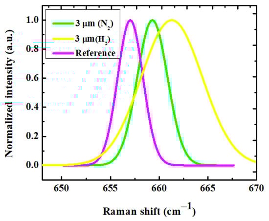 The impurities, point defects, and extended defects alter the stress values in the epitaxially grown films. Raman spectroscopy has been previously demonstrated as an effective tool to calculate stress in thin films [26]. In the case of AlN, high-resolution phonon linewidth can provide the crystalline quality of the thin films. It has been previously reported that for single-crystal bulk AlN, the FWHM of E2 (high) phonon mode is 3 cm−1 [27]. For a 3 μm AlN sample grown with N2 carrier gas, the E2 (high) phonon linewidth was 3.8 cm−1; on the other hand, a 3 μm AlN sample grown with H2 carrier was 5 cm−1. We employed the biaxial stress coefficient to calculate stress based on the Raman shift. Biaxial stress coefficient () depends on the growth technique [26]. We considered 657.04 cm−1, the free-standing sample E2 (high) as the stress-free frequency, and calculated the stress based on k = −4.04 ± 0.3 cm−1/GPa [26]. Figure 8 shows the normalized Raman spectra of E2(high) phonon mode where the blue shift towards the right for the grown samples indicates compressive stress. The compressive stress in AlN film results from the lattice mismatch between sapphire substrate, thermal expansion coefficient mismatch, and stress generated during the coalescence process and impurities [28]. We have previously demonstrated that, due to the delayed coalescence, the N2 carrier grown samples show less compressive stress [8,9]. The formation of voids closer to the interface for the AlN sample grown using H2 carrier gas causes early coalescence, which leads to addition of another low temperature buffer layer to gain similar thickness and higher stress.