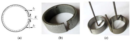 ΔD is the outer diameter of the steel ring; t1, t2 are the thickness of the steel ring and the sprayed coating, respectively; E1, E2 are the elastic moduli of the steel and the sprayed coating, respectively; h is the depth of the layer location, in which the residual stresses were determined; and K is the opening of the ends of a longitudinal through cut on the ring due to occurrence of internal stresses in the coating (Figure 2).