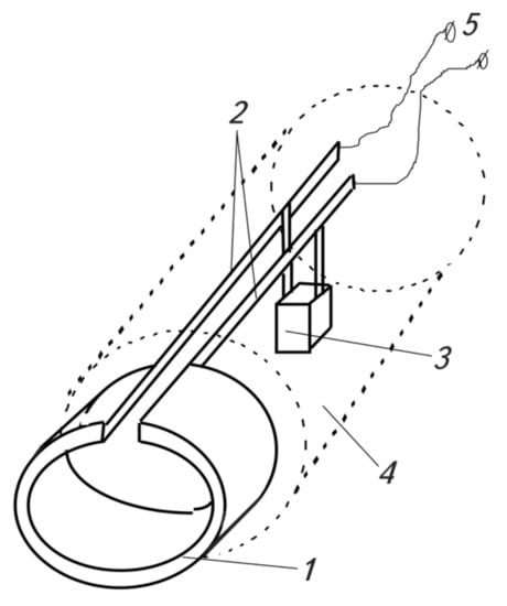 Scheme of the device for measuring internal stresses in the coating directly during CW spraying to the surface of the ring: 1—ring with a longitudinal section (specimen); 2—rods for fixing the strain-gauge sensor; 3—strain-gauge sensor to measure of displacement of the edges of the longitudinal section of ring; 4—screen to protect the strain-gauge sensor from melt drops of CW; and 5—electric wires from the strain-gauge sensor to the measuring device.