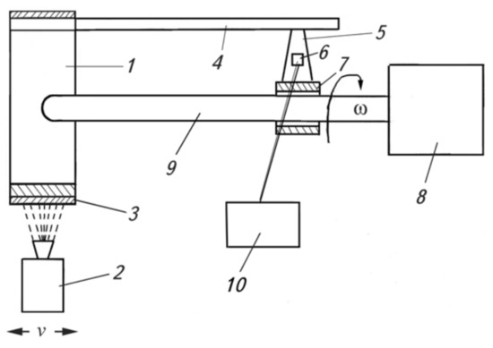 Schematic diagram of the experimental measurement of stresses in the coating during its spraying: 1—ring with a longitudinal section (specimen); 2—electrometallizer; 3—oating; 4—extension rods for fixing the beams of strain-gauge sensor; 5—beam; 6—load cell; 7—strain-gauge sensor body; 8—electric motor; 9—the central rod fixed on the ring, around which the ring rotated in the process of spraying; and 10—device for registering the relative displacement of the ring ends.