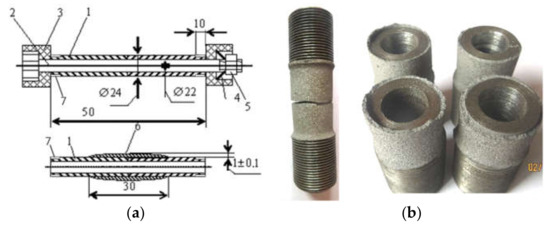 To determine it, two tubular specimens 50 mm long were used, the ends of which were pressed together by means of a bolted connection (Figure 5) [32]. A coating 1.2 mm thick was sprayed on the outer surface of the thus assembled specimen. After that, the specimen was released from the mandrel, pressing the ends of its two halves, and they continued to be held together only due to the coating on their surface. The specimen was loaded on a tensile testing machine FPZ-10, fixing the load P at the moment of destruction of the coating along the contact line of its two halves. The cohesive strength σCS of the coating was determined as σCS = P/S, taking into account the coating area S in the vicinity of the interface of the two halves of the assembled specimen.