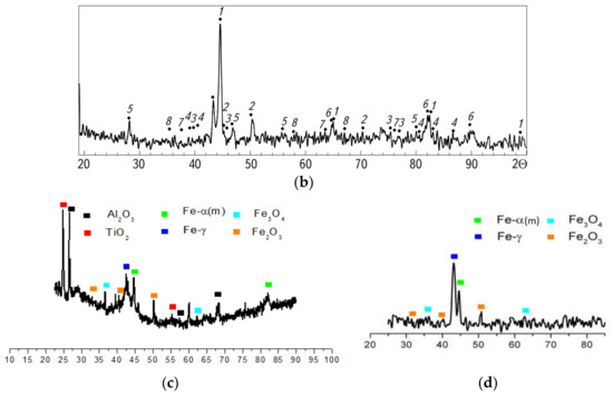 X-ray diffraction patterns of arc coatings of the system (FeCrC + Al) sprayed with CW, the charge of which contained different amounts of aluminum, wt. %: (a) 2: 5, 1—Feα(m); 2—Feγ (residual austenite); Traces: 3—Fe3C; 4—Cr7C3; 5—Cr2O3; 6—Fe3O4; 7—FeO; 8—CrN; 9—AlN; and 10—graphite; (b) 5: 1—Feα(f) + Feα(m); 2—Feγ (residual austenite); Traces: 3—Fe3C; 4—Fe3Al; 5—Al2O3; 6—Cr2O3; 7—Fe2O3; 8—Fe3O4; 9—CrN; 10—AlN; and 11—graphite; (c) 15: 1—Feα(f) + Feα(m); 2—Feγ (residual austenite); Traces: 3—Fe3C; 4—Fe3Al; 5—Al2O3; 6—Cr2O3; 7—Fe2O3; 8—Fe3O4; 9—CrN; 10—AlN; and 11—graphite and (d) 20: 1—Feα(f) + Feα(m); Traces: 2—Cr; 3—FeCr; 4—CrN; 5—Fe2P; 6—Al2O3; 7—Cr2O3; and 8—Fe2O3.