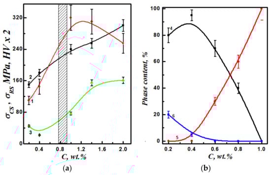 Mechanical properties: (a) Hardness HV (1), cohesive strength σCS (2) and residual stresses σRS (3) and (b) relative amounts of martensite (4), residual austenite (5), and ferrite (6) in coatings versus carbon content C in ASCs deposited by spraying of CW C(0.2…1.4)Cr14. Hatching highlights, the zone of optimal carbon content in the coating to provide the best combination of the analyzed characteristics.