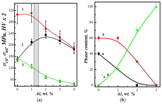 Mechanical properties: (a) Hardness HV (1), cohesive strength σCS (2) and residual stresses σRS (3) and (b) relative amounts of martensite (4), residual austenite (5), and ferrite (6) in coatings versus aluminum content Al in ASCs deposited by spraying of CW C1.4Cr14 Al(0…4). Hatching highlights the zone of optimal aluminum content in the coating to provide the best combination of the analyzed characteristics.