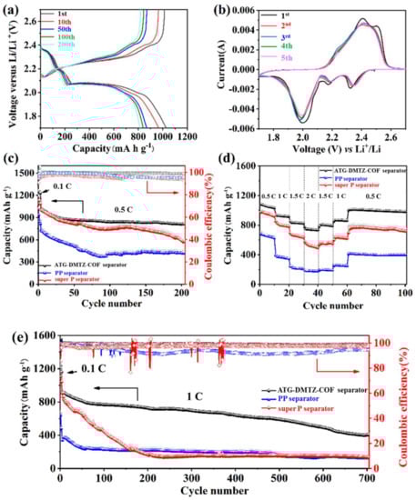 (a) The galvanostatic charge-discharge curve of ATG-DMTZ-COF/PP separator at a current density of 0.5 C. (b) CV curve of ATG-DMTZ-COF/PP separator at a sweep speed of 0.1 mV s−1. (c) The electrochemical cycling performance of three kinds of separator at a current density of 0.5 C. (d) The rate performance of Li-SeS2 batteries with different separator. (e) The long cycle performance of different separator at a current density of 1 C.