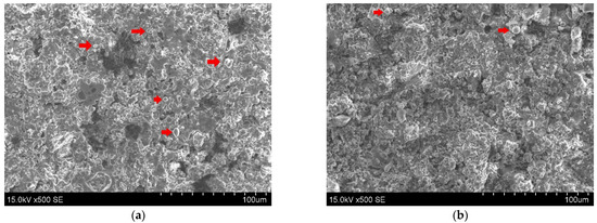 Figure 5 presents the SEM view of the Al2O3 coatings using different plasma torch input power. The structure of all Al2O3 coatings is lamellar and quite similar, and the surface morphology of the coatings is typical for the plasma spray technique. However, there are slightly more unmolten particles on the surface of the Al2O3 coating (marked with red arrows) formed using lower spraying power (Figure 5a,b). With increased input power, the coating seems to become smoother, with fewer dips and peaks on the surface. There are no visible cracks or delamination zones on the sprayed Al2O3 coatings. Therefore, it can be stated that even using the 29.4 kW spraying power, powders were melted sufficiently enough. It should be noted that the molten state of the spraying feedstock particles was improved, and the number of fully melted Al2O3 particles was enhanced with an increase in torch power. The surface of the coating contained more melted areas with overlapped irregular splats (Figure 5e,f). Such phenomena are related, due to both the lower kinetic viscosity caused by higher temperature and larger kinetic energy for higher in-flight velocity, with the enhancement of power increasing from 29.4 to 45.1 kW [2,4,6].