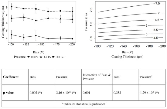 The coefficients of the quadratic equation were calculated using the functionality of the RSM package. Furthermore, a t-test was performed on the impact of the linear factors, the quadratic proportion of the factors and the interaction of bias and pressure on the characteristics of the coating. A probability value p < 0.05 was considered significant within this study.