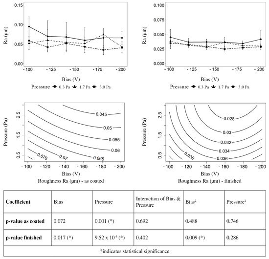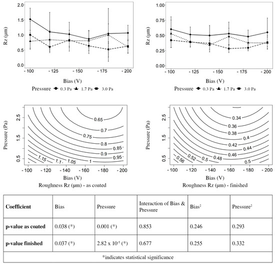 The line roughness (Ra and Rz) exhibits a maximum at the lowest pressure (0.3 Pa) and decreases with an increase in the PVD processing pressure (Figure 2 and Figure 3). This effect is significant for the line roughness parameters. The tables of Figure 2 and Figure 3 display a p value of 0.001 for as coated samples. Finished samples exhibit an even more significant impact of the processing pressure.