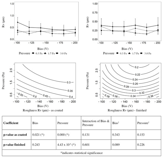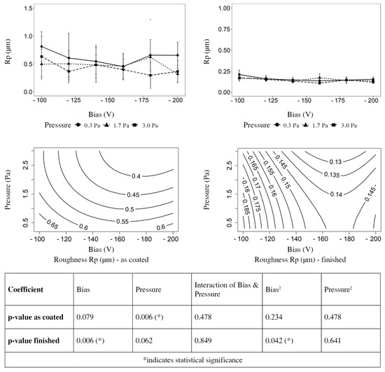 Furthermore, the process pressure shows a significant impact (p = 0.006) on Rp, resulting in a reduction in the peak height when increasing the nitrogen pressure. The process pressure exhibits the same effect on the maximum valley depth (Rv) with p < 0.001 for as coated and finished samples, respectively.