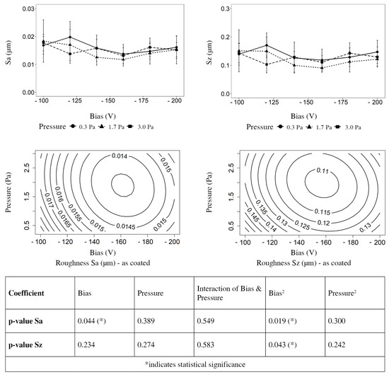 The surface roughness values Sa and Sz exhibit a local minimum at a substrate bias of −160 V for all pressures (Figure 6). Accordingly, in the table of Figure 6, the RSM analysis shows a significant impact of the substrate bias or the quadratic proportion of the bias on all surface roughness parameters, while the pressure does not exhibit a significant impact on the surface roughness.