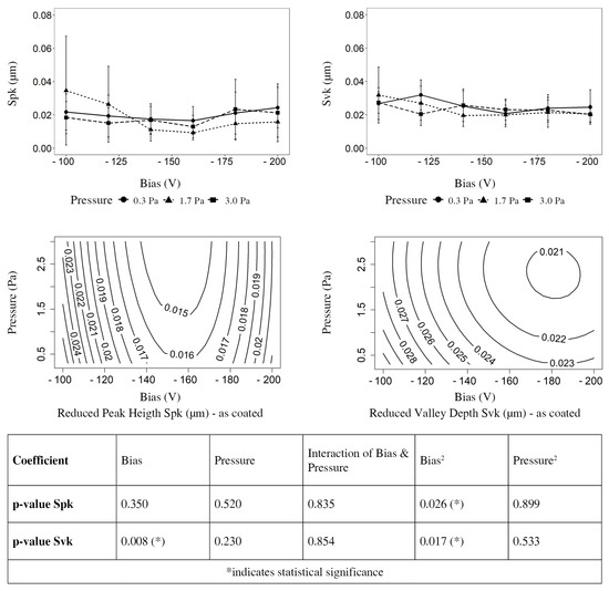 The mean peak height Spk also exhibits a local minimum of 0.009 µm–0.016 µm at a bias of −160 V for all pressures in this test series (Figure 7). Svk shows a minimum at −180 V. The quadratic proportion of the substrate bias presents a significant processing factor for Spk and Svk in the table of Figure 7.