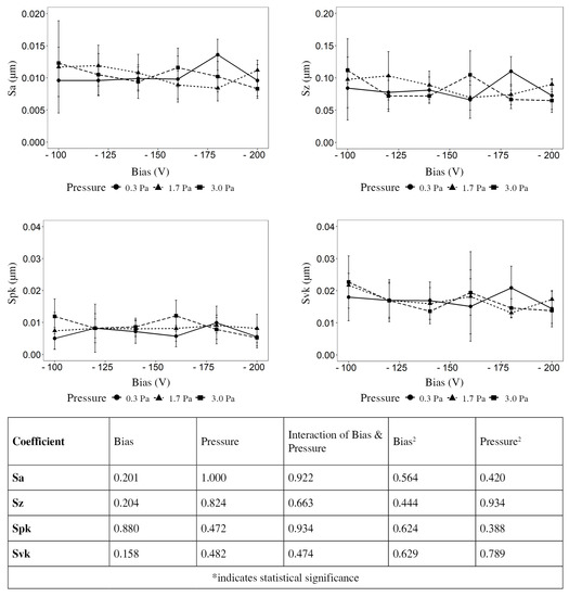 - The line roughness (Ra, Rz, Rp, Rv) and the surface roughness (Sa, Sz, Spk, Svk) are significantly affected by the bias and the pressure.