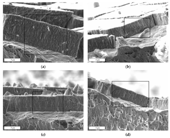 The SEM analysis shows a qualitative difference in the coatings applied at a bias of −100 V (Figure 9a at 3.0 Pa and Figure 9c at 0.3 Pa) and −200 V (Figure 9b at 3.0 Pa and Figure 9d at 0.3 Pa). The TiNbN layers show a more columnar structure at a bias of −200 V, compared to lower negative bias parameters. The columns at a higher negative bias show a continuous growth from the substrate interface to the top layer of the coating.