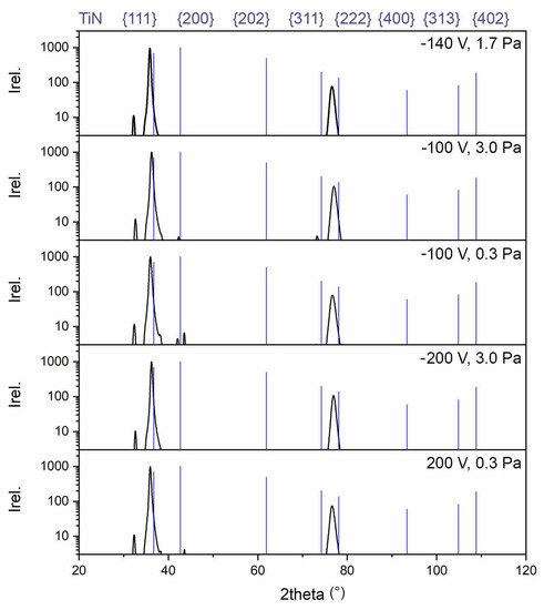 The impact of the pressure on the coating thickness of titanium-based nitride coatings was also examined by Joo et al. [24], who also described a significant increase in coating thickness as a result of an increased nitrogen pressure during the layer application. Keles et al. [40] did not find a significant impact of the pressure on the coating rate. However, this study may not be comparable to the presented data in our study, due to a limited range of pressures. A decrease in the coating thickness, when increasing the substrate bias, is consistent with the findings of Joo et al. [24] and Keles et al. [40] for TiAlN and TiN, respectively.
