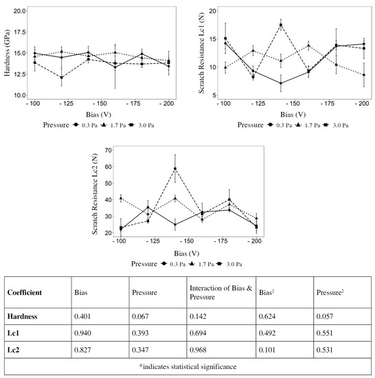 All test result plots were illustrated as mean ± standard deviation. The coating characteristics (coating thickness, roughness, hardness, and scratch resistance) were presented as a function of the bias and the pressure.