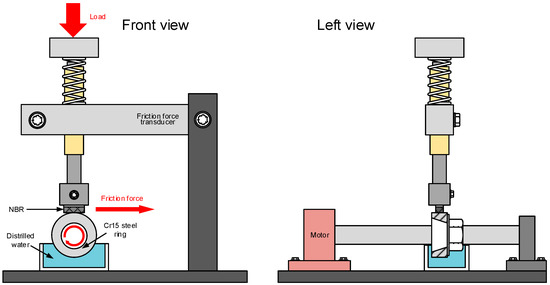 Tribological tests of (Ti:N)-GLC films were conducted by a tribometer (MFT-5000, Rtec Ltd., San Jose, CA, USA) with a block-on-ring configuration, as shown in Figure 1. The coated NBR (size 15.5 mm × 6.0 mm × 4.0 mm) was bonded to the stator as the block and a dynamic ring (Cr15 steel, roughness Ra 0.2, size Ф35 mm × 10 mm) was set as the rotor. The bottom of the ring was immersed in the distilled water and an injector that dripped water at a certain frequency was bundled with the block to ensure the abundance of lubricant. All friction circles were accomplished under the same environmental conditions (25 °C, relative humidity 35%). The load 5 N and 10 N was applied, and the rotational speed was 400 rpm. Each test was performed for 30 min. The worn surface morphology and profile of wear tracks were obtained by a 3D microscope and white light interferometer. The specific wear rate of the worn surface was calculated by the following equation: , where is the friction stroke, is the applied load and is the wear volume determined by integrating the cross-sectional profile of the wear track.