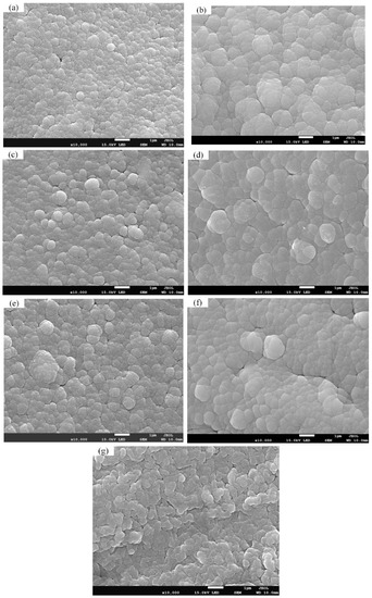 The overview of SEM images of surface morphology of (Ti:N)-GLC films on NBR are presented in Figure 2. At low magnification, it is shown that all (Ti:N)-GLC films are divided into micro-scale patches by gaps and ridges, attributed to the mismatch thermal strain of NBR and GLC films. This micro-patched structure is beneficial to internal stress release and improves the flexibility of films deposited on polymers [26]. Figure 3a–c shows the patches of films at 100 W in details: (1) the gaps are closed and perpendicular to the ridges, while few defects (cracks and debris) arise nearby; (2) there are still other patches under the gaps, indicating the staggered growth; (3) the patches are relatively flat and complete. These differences prove that doping of Ti and N improves the toughness of GLC films. The formation of closed gaps and ridges is directly related to the cooling-down process during the deposition. Furthermore, sharp cracks and scattered debris are found near the gap-ridge networks on Ti-C (200), TiC-C (200) and TiN-C (200) films, as is shown in Figure 3d–f, indicating greater internal stress and relatively poor toughness. These defects may arise from the brief and rapid heating and cooling of films caused by particle bombardment during exhaust. Additionally, they tend to peel off under pressure, leading to bad resistance to the erosion and immersion of water. At high magnification, as shown in Figure 4, the surface morphology of (Ti:N)-GLC films exhibit cauliflower-like microstructure, indicating a columnar growth of films, different from the worm-like microstructure of GLC films. As RF target power increases, the microstructure becomes denser, with worse uniformity of clusters.