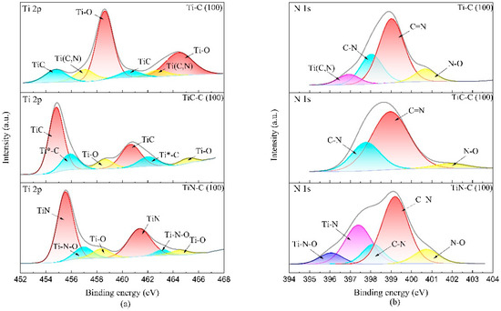 For detailed chemical bonding of (Ti:N)-GLC films, XPS analysis was taken. To acquire the content of each bonding type, the XPS results were deconvoluted with the Gaussian function. The deconvolution results are illustrated in Figure 6 and Table 2, Table 3 and Table 4. For the Ti-C series, the strongest peaks at 458.6 eV/464.4 eV can correspond to Ti 2p3/2 and Ti 2p1/2 peak of TiO2, respectively [31], which is proved by the O 1s peak of O-Ti at 529.3 eV observed in the spectra of O 1s. Considering the Ar/N2 atmosphere, the conclusion can be drawn that Ti atoms existed primarily as a solid solution in an amorphous carbon matrix and got oxidized once the films were exposed to air over a few days. Moreover, the peaks at 454.8 eV/460.6 eV in Ti 2p spectra are attributed to TiC, and the last couple of peaks at 456.9 eV/462.9 eV are attributed to Ti(C,N) [32,33]. The new-formed TiC derives from the higher bombardment energy of Ti atoms at higher RF power. Additionally, the formation of Ti(C,N) could be inferred that a certain number of carbon atoms exist in the interstices of TiN formed earlier, since Ti atoms prefer to bonding with N rather than C atoms due to the lower Gibbs free energy needed [33]. N 1s spectra of Ti-C series in Figure 6b are fitted with four sub-peaks: 396.9 eV, 398.0 eV, 399.1 eV and 400.8 eV, representing Ti(C,N), C-N, C=N, and N-O [33]. The C 1s spectra in Figure 6c consist of five Gaussian decomposition peaks: 282.0 eV, 284.0 eV, 284.8 eV, 286.0 eV and 288.0 eV, representing C-Ti, C=C, C-C, C=N and C-O, respectively [31,33,34,35]. The fitted C-Ti confirms that Ti atoms tend to bond with C atoms at higher RF power, consistent with the peaks of TiC shown in Ti 2p spectra. Furthermore, the carbon sp3/sp2 ratio is reduced from 0.20 to 0.14, much below that of GLC films at 0.27. Concurrently, the peak area ratio of Ti(C,N) and TiC increases from 0.11 to 0.36. This indicates that more incorporation of Ti atoms at higher power will form more carbides and carbonitrides and break some sp3 bonds to form a more sp2 bonded phase, consistent with the Raman analysis mentioned above. For the TiC-C series, Ti 2p spectra can be deconvolved into three couples of sub-peaks as follow: 454.6 eV/460.6 eV, 455.9 eV/462.0 eV and 458.6 eV/464.6 eV. The peaks at 458.6 eV/464.6 eV are owing to the Ti-O bond and another couple of peaks at 454.6 eV/460.6 eV belong to TiC [34]. The last couple of broad peaks at the binding energy of 455.90 eV/462.0 eV could be inferred as nonstoichiometric Ti*-C [31]. The N 1s spectra of the TiC-C series can be deconvolved into three peaks centered around 397.9 eV, 399.1 eV and 402.0 eV, regarded as C-N, C=N and N-O, implying the nonbonding effect of TiC on N atoms. The C 1s spectra of TiC-C series are fitted with six peaks: 282.0 eV, 282.8 eV, 284.0 eV, 284.8 eV, 286.0 eV and 288.0 eV, representing C-Ti, C-Ti*, C=C, C-C, C=N and C-O, respectively [34,36]. The C-Ti* bond may be attributed to the interface phase between the amorphous carbon matrix and doped TiC grains. Unlike ones in the middle of clusters, Ti atoms at the clusters’ interface are in contact with C atoms both inside and outside clusters, but only neighbor Ti atoms inside clusters [31]. Moreover, the peak intensity ratio of C-Ti* to C-Ti is reduced from 0.68 to 0.42 as RF power grows, indicating the larger grain size of TiC at higher RF power, as is reported by Lewin et al. [34]. For the TiN-C series, the Ti 2p spectra consist of three couples of sub-peaks as follow: 455.5 eV/461.4 eV, 457.0 eV/463.1 eV and 458.6 eV/464.5 eV, recognized as TiN, Ti-N-O and Ti-O, respectively [32,33,35]. The N 1s spectra of the TiN-C series consist of five peaks: 400.7 eV, 399.2 eV, 398.1 ± 0.1 eV, 397.2 ± 0.1 eV and 396.0 eV, corresponding to N-O, C=N, C-N, Ti-N and Ti-N-O. Additionally, Ti-N-O bonding can be confirmed by O 1 s peak around 531.4 eV. It must be mentioned that no bonding of Ti-(C,N) was detected. The C 1s spectra of the TiN-C series can be fitted with four couples of sub-peaks at 284.0 eV, 284.8 eV, 286.2 eV and 288.2 eV, representing C=C, C-C, C=N and C-O, respectively.