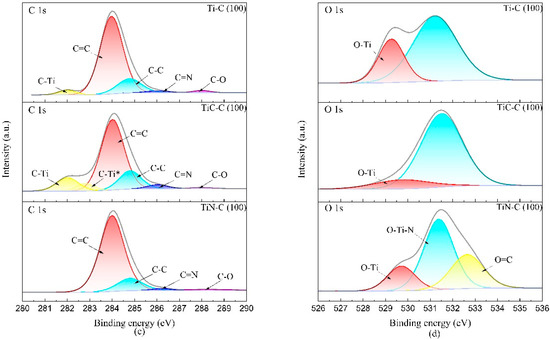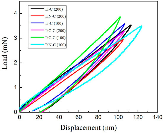 It is widely confirmed that the H/E and H3/E2 ratios are closely relevant to the elastic strain to failure and resistance to plastic deformation of films, respectively [36,38], considered indicators of the wear resistance performance and toughness of films, they are both calculated and listed in Figure 9b. Considering these two ratios, TiC-C films and Ti-C (100) films display excellent mechanical properties. Concurrently, Ti-C (200) and TiN-C (200) films perform worse, consistent with the poor toughness shown above in Figure 3d–f.