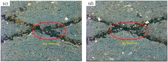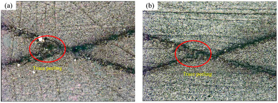 Moreover, the influence of RF power on the lubrication mechanism could be explained as the following three aspects: (1) When RF power grows, the size of the dopant groups such as TiO2, Ti(C,N), TiC, TiCxOy and TiN, etc., on the film surface increases, resulting in poor consistency and increased roughness. The bumpy surface produces a large amount of wear debris mainly composed of the dopant groups mentioned above on the lubricating interface during solid-to-solid contact. The wear debris exerts an abrasive effect on the interface, which accelerates the deterioration of the film. (2) As RF power grows, the film becomes hydrophobic, which is hard for the molecular-scale lubricating water film to survive on the surface. (3) As mentioned above, the internal residual stress increases with RF power, and the stress release leads to a significant increase of microscopic defects shown in Figure 3d–f and poor adhesion to the NBR substrate described in Figure 7, weakening the load-bearing capacity of films. Eventually, films deposited at higher RF power are more likely to peel off, resulting in local failure of lubrication. However, for the TiC-C series, thanks to the stability of TiC, no bonding effect with N, and good compatibility with carbon matrix, the film maintains better mechanical properties, so that the load-bearing capacity remains.