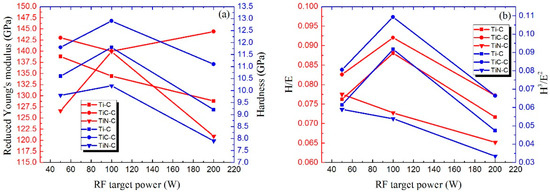 Nanoindentation was carried out to investigate the hardness (H) and reduced Young’s modulus (E) of (Ti:N)-GLC films. Nanoindentation curves of (Ti:N)-GLC films are shown in Figure 8. Additionally, the results were calculated with reference to the standard Oliver and Pharr approach [37], and listed in Figure 9a. For the Ti-C series, the incorporation of Ti and N exerts an impressive influence on the mechanical properties of films. When RF power is below 200 W, the strengthening effect on mechanical properties could be attributed to commonly formed TiO2, TiC and Ti(C,N) phases, which have good mechanical properties and relatively little effect on the connectivity of amorphous carbon matrix and carbon sp3 content. However, as RF power grows, the balance is broken, and more and larger dopant groups break the connectivity of the amorphous carbon structure and promote carbon phase transition from sp3 to sp2, eventually reducing hardness and leading to a reduced Young’s modulus. For TiC-C series, the (Ti:N)-GLC films all perform better mechanical properties than GLC films, attributed to the good compatibility of Ti carbides with carbon and the stable sp2/sp3 ratio mentioned above. The highest hardness (H = 12.9 GPa) arises at 100 W and the highest value of the reduced Young’s modulus (E = 144.4 GPa) is at 200 W. For the TiN-C series, when the RF power is 100 W and below, the mechanical properties of (Ti:N)-GLC films are both better than those of GLC films, and the highest values (H = 10.2 GPa and E = 139.9 GPa) are obtained at 100 W. However, as RF power grows further, the mechanical properties of films degenerate rapidly, even worse than those of GLC films. In general, the hardness (H) and reduced Young’s modulus (E) of (Ti:N)-GLC films in this work (H = 7.9 GPa~12.9 GPa, E = 120.9 GPa~144.4 GPa, respectively) are comparable to those (H = 8.9 GPa~11.6 GPa, E = 122.0 GPa~153.6 GPa, respectively) of Ti-containing GLC films obtained by Wang et al. [20].