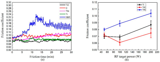 Friction coefficient (CoF) of (Ti:N)-GLC films under boundary lubrication: (a) friction coefficient curves of films at 100 W; (b) the mean steady-state friction coefficient vs. RF power.