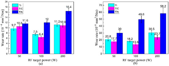 The calculated specific wear rate of (Ti:N)-GLC films is shown in Figure 14. For the Ti-C series, Ti-C (100) film obtains the lowest wear rate value: 7.52 × 10−8 mm3/Nm under mixed lubrication and 18.2 × 10−8 mm3/Nm under boundary lubrication. When RF power is 200 W, the wear rate reaches the maximum value at 11.2 × 10−8 mm3/Nm and 30.5 × 10−8 mm3/Nm, respectively. For the TiC-C series, films reveal a low and stable wear rate: 6.4 × 10−8 mm3/Nm~10.9 × 10−8 mm3/Nm under mixed lubrication and 13.6 × 10−8 mm3/Nm~23.7 × 10−8 mm3/Nm under boundary lubrication. For the TiN-C series, the wear rate always increases with RF power. Moreover, the wear rate rises sharply to 58.2 × 10−8 mm3/Nm with RF power under boundary lubrication, even worse than in GLC films. Overall, the wear rate values of Ti-C and TiC-C films are close, and TiC-C (100) film performs the best. In contrast, the anti-wear performance of TiN-C films is the worst, especially under boundary lubrication.