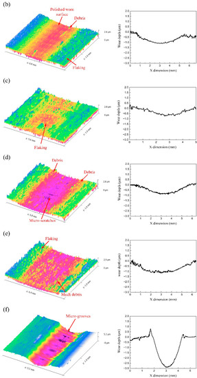 Worn surface morphology and profile of wear tracks: (a) Ti-C (100) mixed; (b) TiC-C (100) mixed; (c) TiN-C (100) mixed; (d) Ti-C (100) boundary; (e) TiC-C (100) boundary; (f) TiN-C (100) boundary.