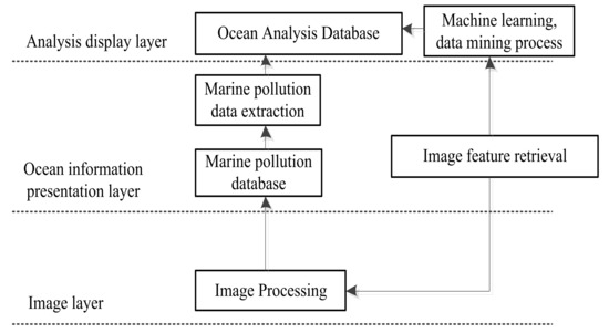 The introduction of intelligent digital remote sensing technology is to rely on remote sensing satellites to build intelligent data modules to monitor marine environmental pollution and obtain available information through screening and analysis of multi-layer databases. Intelligent digital remote sensing technology structure includes image layer, ocean information display layer, and ocean analysis display layer. The function of the image layer is to use remote sensing satellites to remotely sense the marine environment, to simply process and package the captured pictures, and to send them to the marine information processing interface through wireless transmission [18,19,20]. The marine information processing layer digitally displays the monitored information in the image layer and processes it by relying on the marine object database and the marine environment physical field analysis database. The data is passed to the analysis display layer for data analysis. The analysis display layer accepts the data information of the ocean information display layer and uses the data link mode, image data module, and data mining technology to perform image processing. The intelligent data remote sensing database structure process is shown in Figure 1. The main function of the marine satellite image database is to process and segment satellite images, identify objects, construct multi-dimensional image organization, and calculate the physical distance between images. The main function of the marine object database is to analyze the manifolds of the marine environment physical field, the embedded dimensions of the marine physical field manifolds, the low-micro distribution analysis, and the feature extraction of marine objects [21].